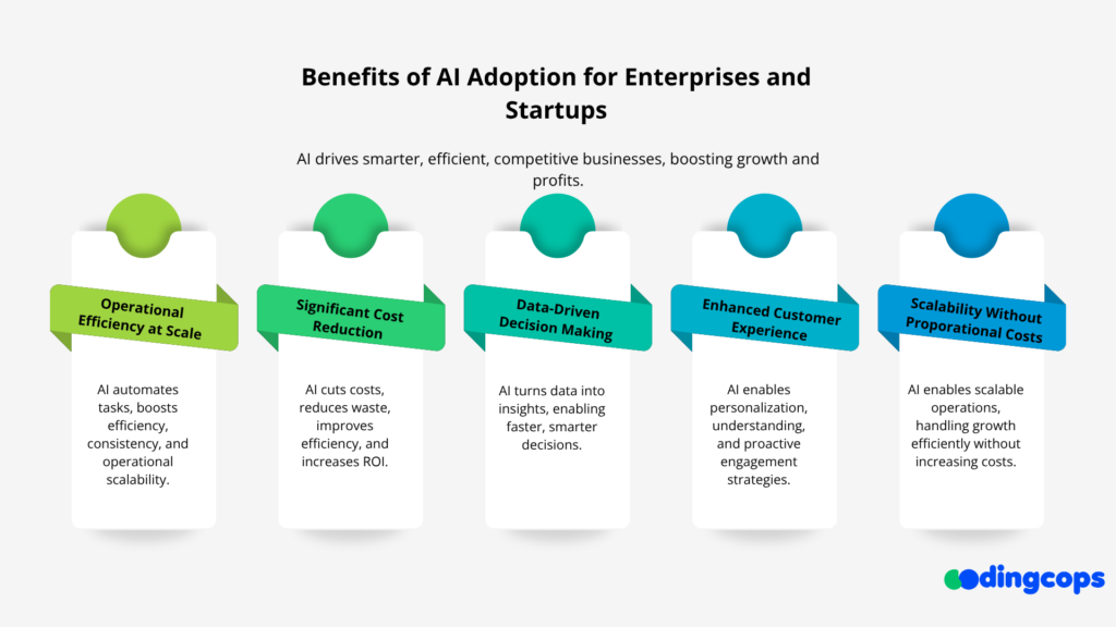 AI adoption is no longer just about innovation; it’s about building a smarter, more efficient, and more competitive business. Whether you are an enterprise managing complex operations or a startup trying to scale, AI offers tangible advantages that directly impact growth and profitability.